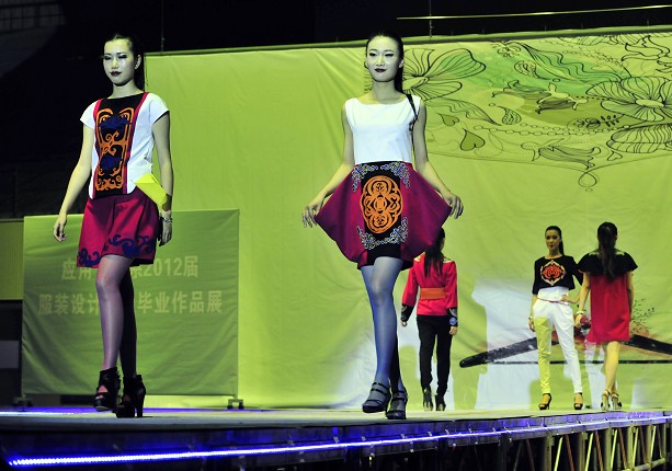 前日,武汉商业服务学院应用艺术系2012届服装专业学生举行毕业作品展。繁花似锦、民族调、行者·布法等23个系列,共110件服装均是学生花了3个月的时间设计制作的。其中运用民间的传统剪纸工艺制作的时装引人注目,这些服装采用刺绣与拼贴的技巧,将民间艺术与时尚结合,厚重中体现出飘逸的美。