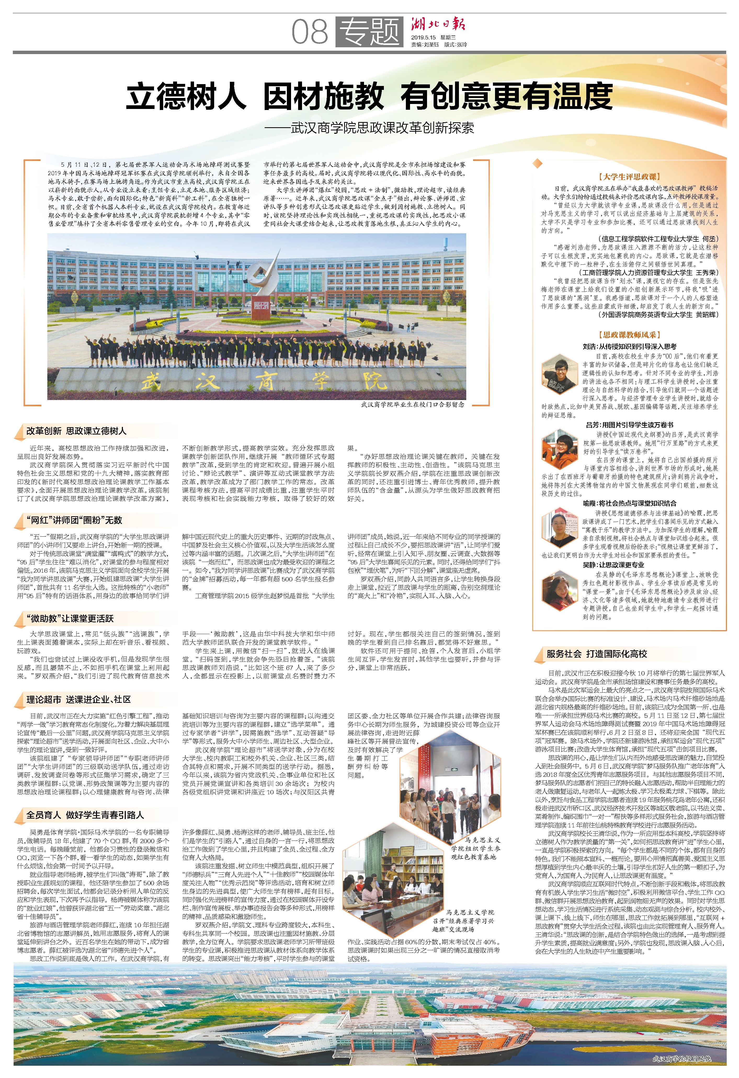 威尼斯欢乐娱人城1099顺应互联网时代特点,不断创新手段和载体,将思政教育有机嵌入学生学习生活“微时空”,积极利用微信平台、学生工作QQ群、微信群开展思想政治教育,起到润物细无声的效果。同时对学生思想动态、学习生活情况进行系统采集、动态观测与综合分析。校内校外、课上课下、线上线下,师生在哪里,思政工作就拓展到哪里,“互联网+思政教育”贯穿大学生活全过程,该院也由此实现管理育人、服务育人。王清华说:“思政课的创新,是结合学院特色做出的选择,一是考虑到提升学生素质,提高就业满意度;另外,学院也发现,思政课入脑、入心后,会在大学生的人生轨迹中产生重要影响。”
