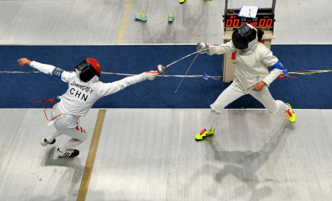 现代五项项目包括击剑、游泳、马术和激光跑(跑步、射击联项)。