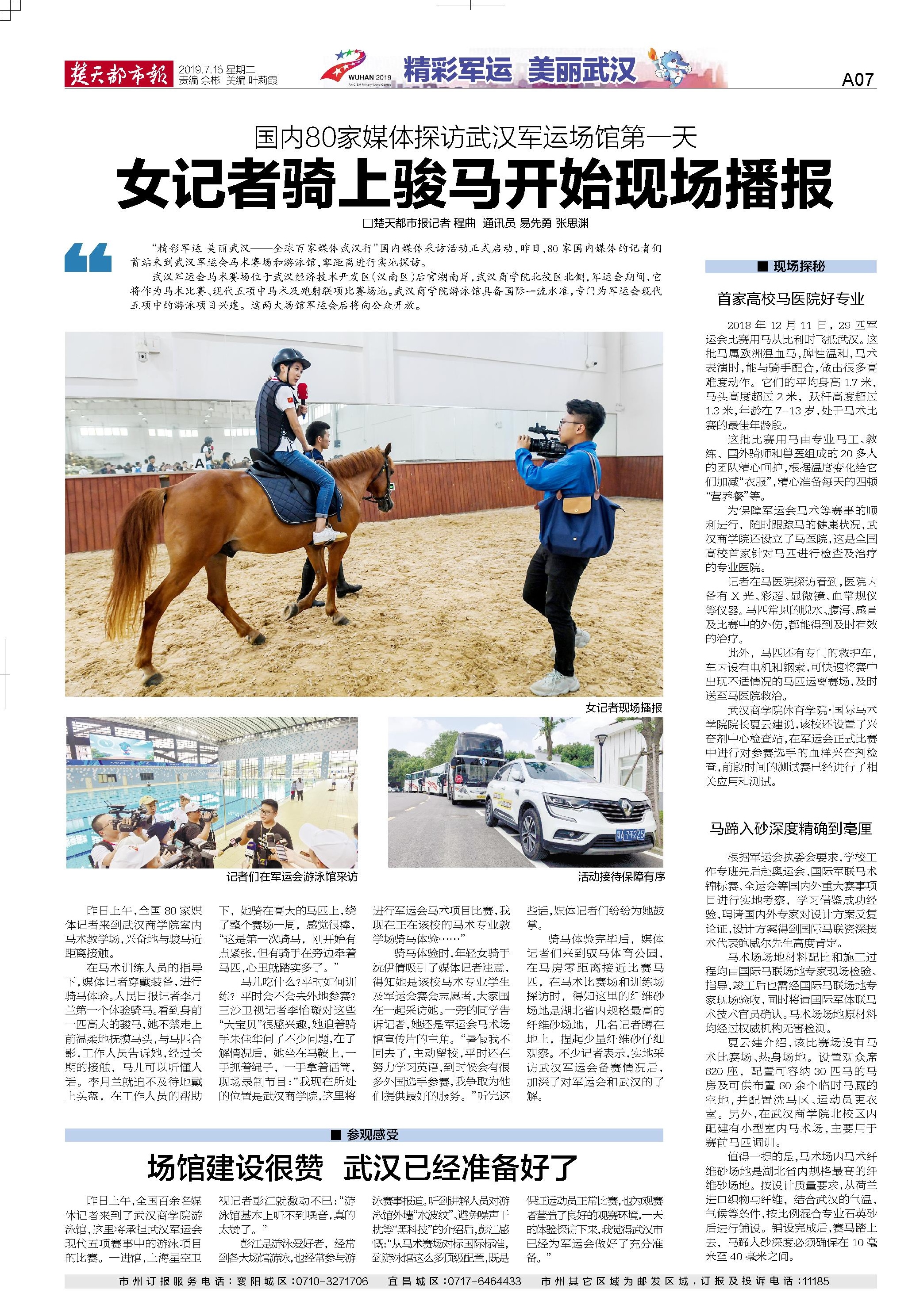 “精彩军运美丽武汉——全球百家媒体武汉行”国内媒体采访活动正式启动,昨日,80家国内媒体的记者们首站来到武汉军运会马术赛场和游泳馆,零距离进行实地探访。