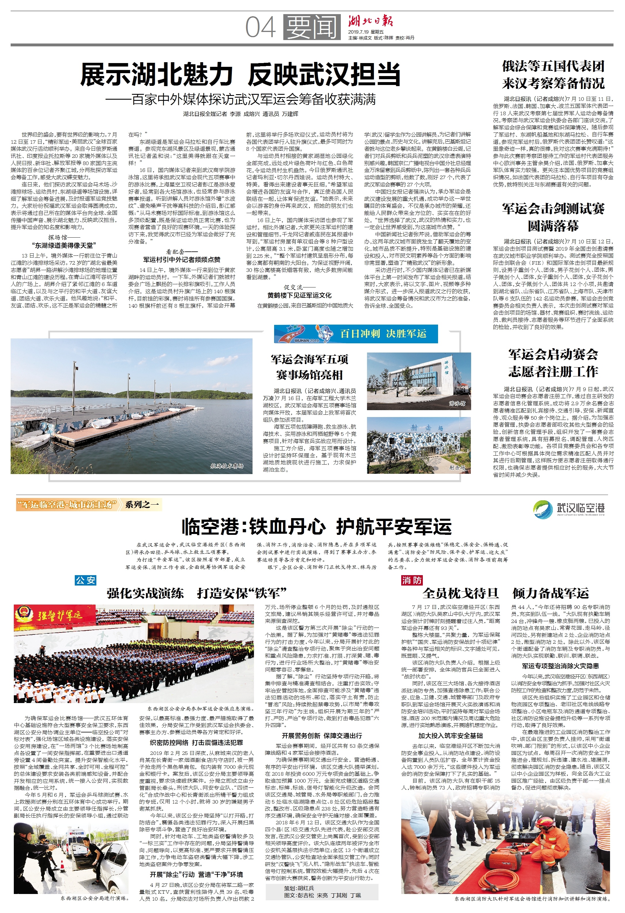 连日来,他们探访武汉军运会马术场、沙滩排球场、运动员村、东湖绿道等场馆设施,详细了解军运会筹备进展,及时报道军运竞技魅力。大家纷纷祝福武汉军运会取得圆满成功,表示将通过自己所在的媒体平台向全球、全国传播中国声音、展示湖北魅力、反映武汉担当,提升军运会的知名度和影响力。