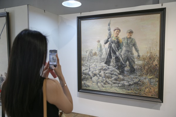 校长彭瑜为周祖银教授颁发证书,宣布周祖银绘画作品展正式开幕,由周祖银捐赠的作品《向往》及其他展出作品都将在艺术展示厅进行展示。此次周祖银的作品展名为《常·态》,意为记录人民生产生活中常态化的形象,在一幅幅感染力极强的带有农民乡村特色的作品面前,校领导和来宾纷纷驻足观看,感受来源于艺术的独特魅力。