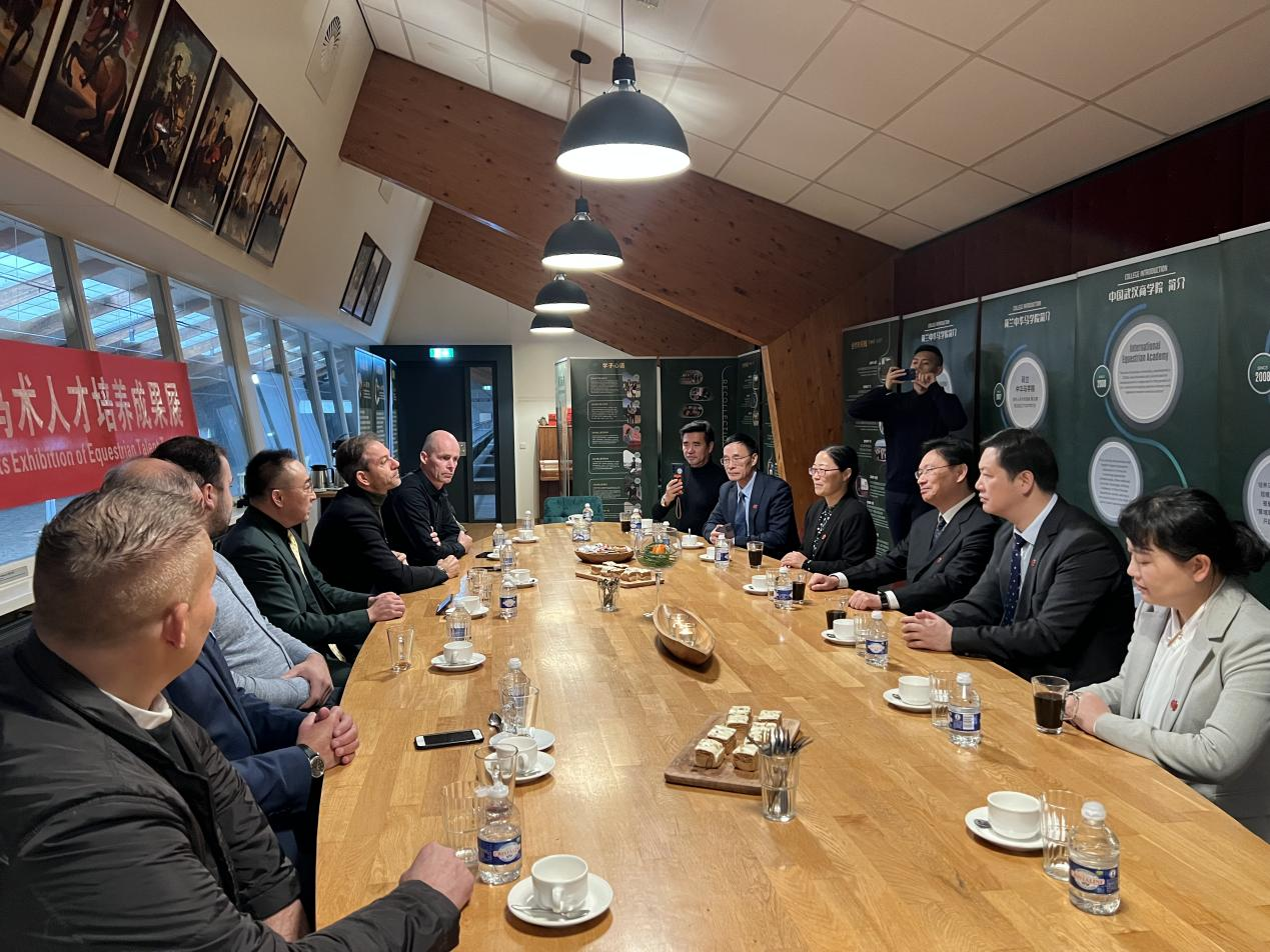 11月18日,代表团回访荷兰中华马学院,会见了中华马学院校长蒋汉儒,对荷兰马术人才培养、马场配套设施及马匹兴奋剂设备等进行调研,并共同举办学生海外实践教学成果展,双方对中华文化传播途径和马术人才培养成果进行研讨。最后为深化海外实践教学基地建设,签订教师、学生交流项目和海外实践教学基地协议。