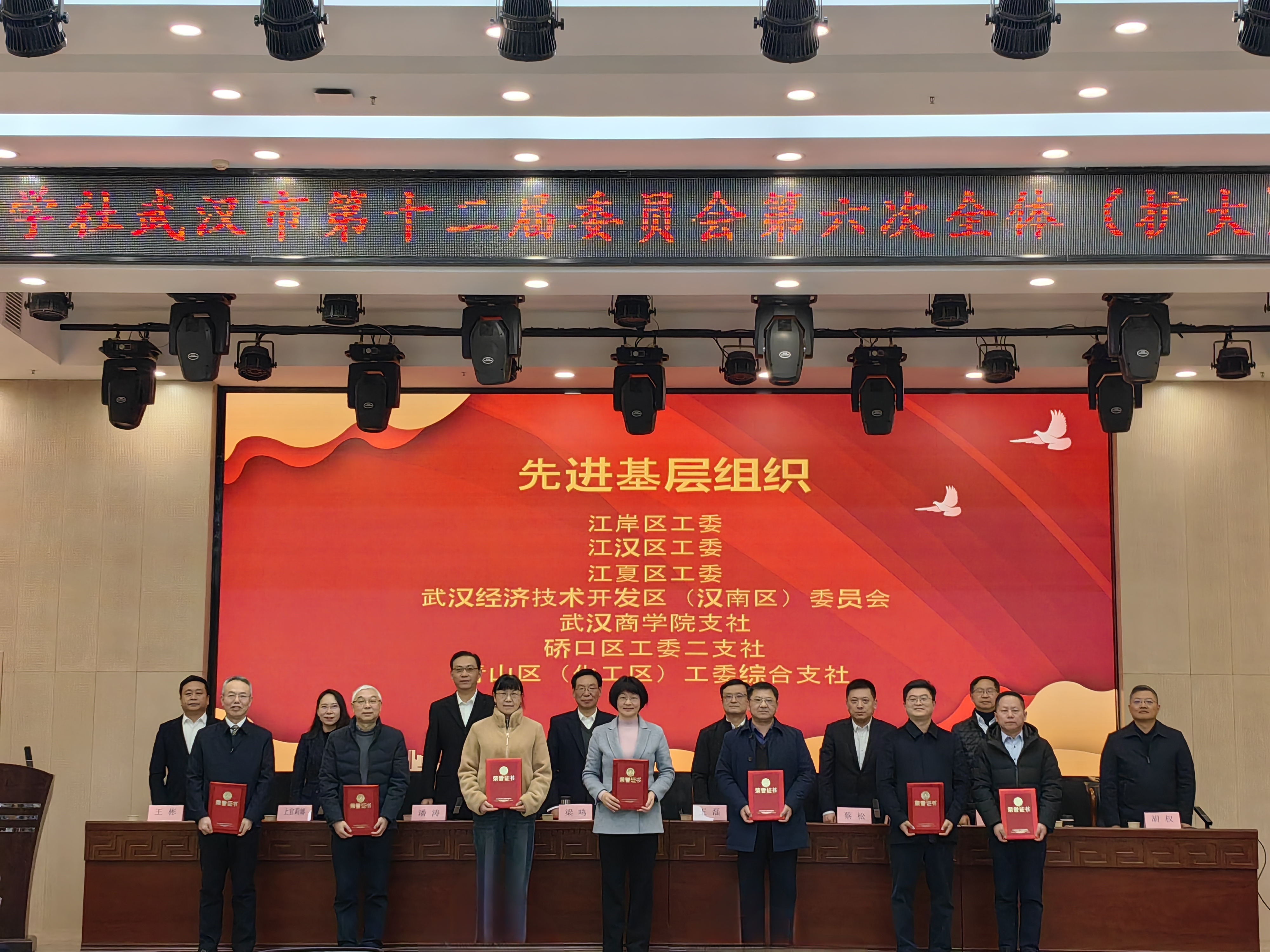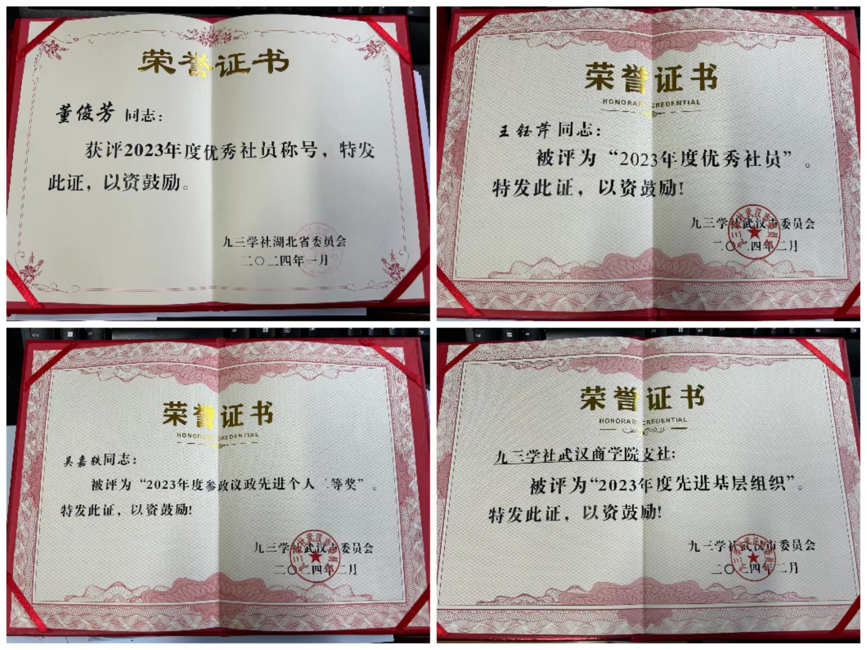 本网讯 2月29日下午,九三学社武汉市第十二届委员会第六次全体(扩大)会议在市民主党派大楼一楼多功能厅召开,会议表彰了2023年度社市委先进集体和先进个人。九三学社威尼斯欢乐娱人城1099支社获得多项个人和集体奖励,其中董俊芳、王钰芹分别荣获社省委和社市委优秀社员,吴嘉轶获评参政议政先进个人二等奖,支社也被评为2023年度先进基层组织。