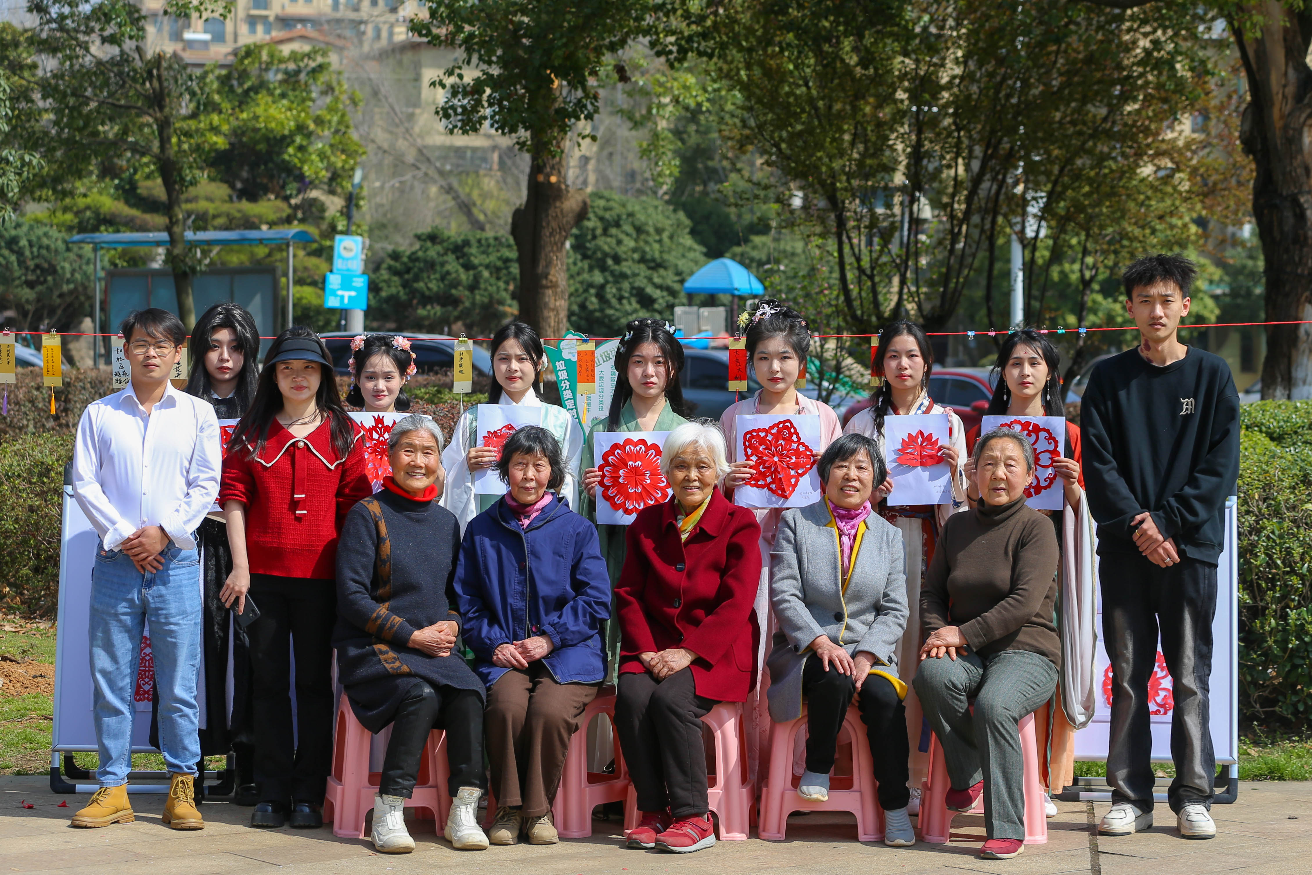 “镂金作胜传荆俗,翦彩为人起晋风。”活动尾声,同学们与居民们一同制作剪纸,感受非遗手工的传统艺术之美。红色的宣纸在同学们的手中变成各式各样的图案,工作人员将这些制作好的窗花贴在纸上,各式各样的小窗花并排排列,同学们身着汉服,手持窗花,体验着非遗文化带来的无穷魅力。
