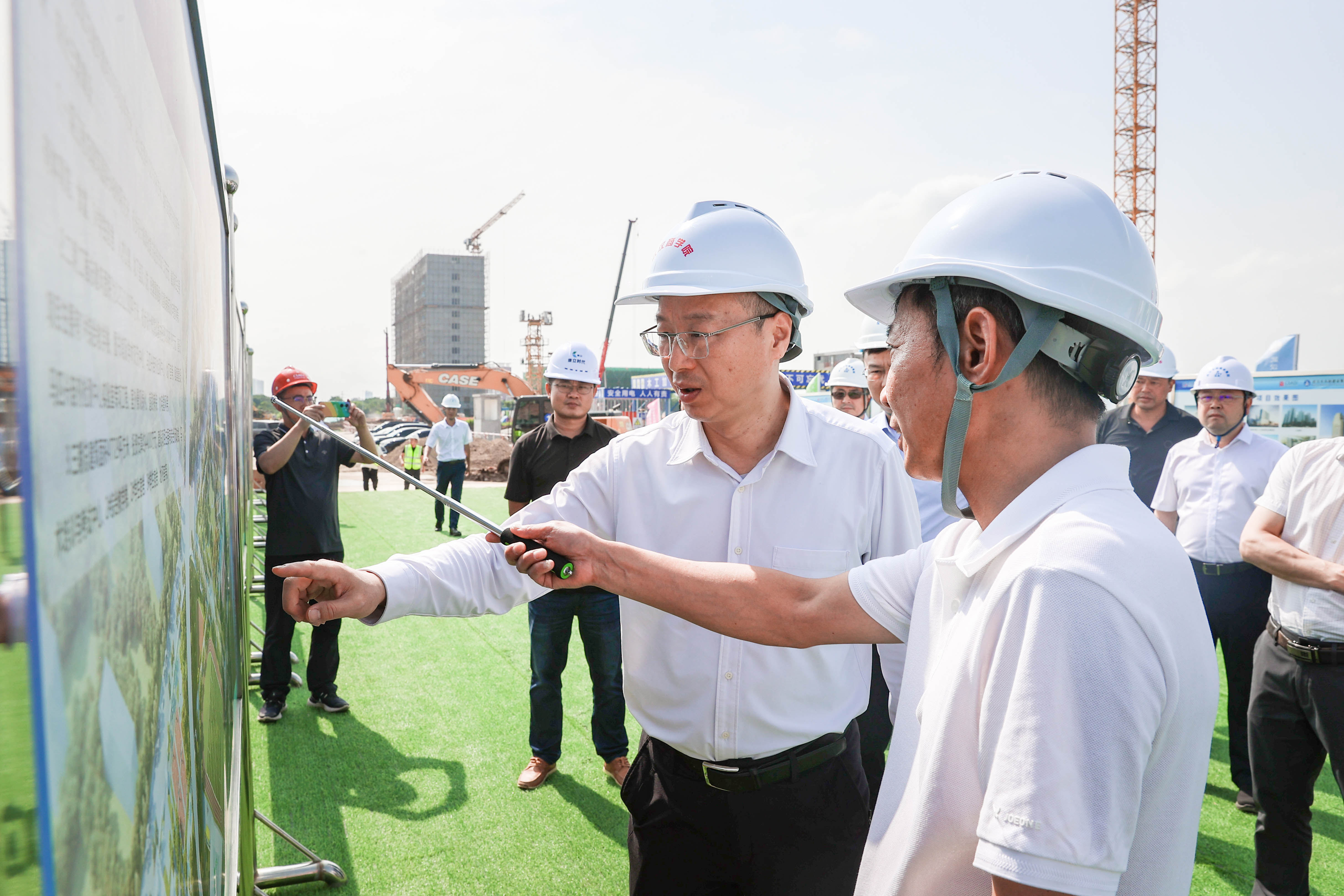 随后,在施工现场,负责人详细介绍了学校主要建筑类别、功能及建设情况。其中,图书馆及学术交流中心的设计颇有巧思,形似一座错落堆叠的“书山”,其底层与北大门的拱形线条营造出“时空之桥,智慧之眼” 的意境。